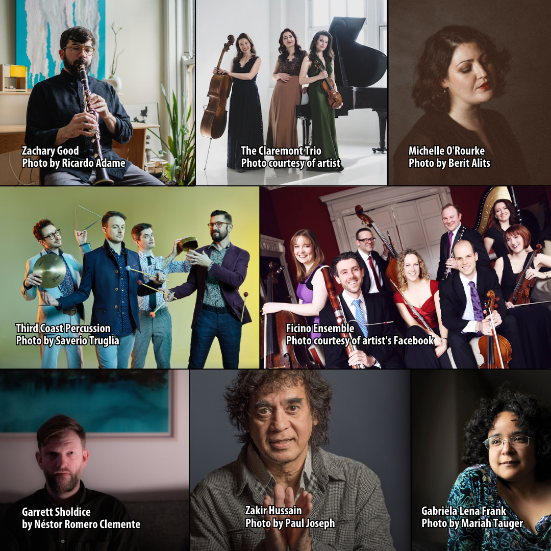 Also featured are works by Justine F. Chen, Ephraim Champion, Eleanor Alberga, Zachary Good, Garrett Sholdice, and Gabriela Lena Frank. Performers include cellist Matt Haimovitz, pianist Orli Shaham, saxophonist Timothy McAllister, pianist Liz Ames, baritone Morgan Pearse, percussion ensemble Third Coast Percussion, vocalist Michelle O’Rourke, the Ficino Ensemble, and the Claremont Trio.